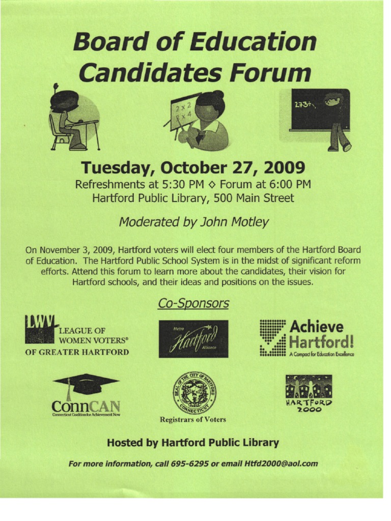 Hartford voters will elect four members of the Hartford Board of Education on November 3, 2009. Attend this forum to learn more about the candidates, their vision for Hartford schools.