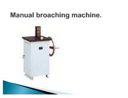 Broaching is a machining process that involves using a broach tool to cut a precise shape or pattern in a workpiece by pushing or pulling the tool in a linear cutting path. Key advantages of broaching include high production rates, high accuracy and surface finish in a single pass of the tool. Common broaching operations include cutting keyways, holes, and contours. Broaching machines typically use either horizontal or vertical configurations to hold the workpiece and move the broach tool.