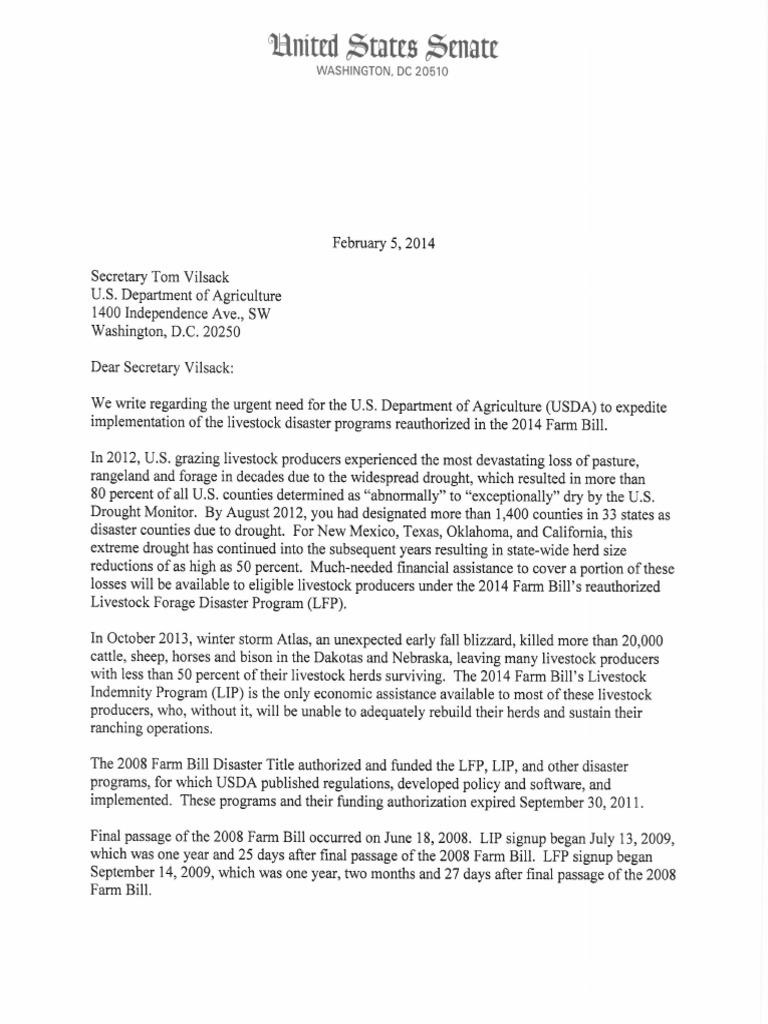 U.S. Senators Tom Udall and Martin Heinrich send a bipartisan letter to U.S. Department of Agriculture Secretary Tom Vilsack, encouraging the USDA to expedite the implementation of the livestock disaster programs reauthorized in the 2014 Farm Bill.