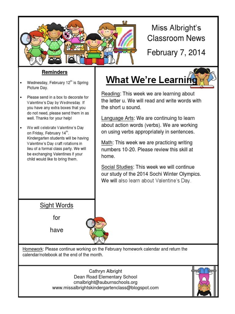 Reading: This week we are learning about the letter u. We will read and write words with the short u sound. Language Arts: We are continuing to learn about action words (verbs). We are working on using verbs appropriately in sentences. Math: This week we are practicing writing numbers 10-20. Please review this skill at home. Social Studies: This week we will continue our study of the 2014 Sochi Winter Olympics. We will also learn about Valentines Day.