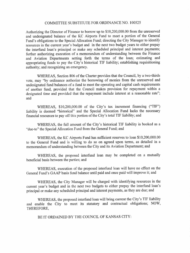 KC Ordinance approving loan from KC Aviation Dept to KC Finance Dept, July 1, 2010