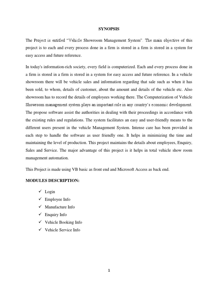 The main objective of this project is to each and every process done in a firm is stored in a firm is stored in a system for easy access and future reference. In today's information-rich society, every field is computerized. Each and every process done in a firm is stored in a firm is stored in a system for easy access and future reference. In a vehicle showroom there will be vehicle sales and information regarding that sale such as when it has been sold, to whom, details of customer, about the amount and details of the vehicle etc. Also showroom has to record the details of employees working there. The Computerization of Vehicle Showroom management system plays an important role in any countrys economic development. The propose software assist the authorities in dealing with their proceedings in accordance with the existing rules and regulations. The system facilitates an easy and user-friendly means to the different users present in the vehicle Management System. Intense care has been provided in each step to handle the software as user friendly one. It helps in minimizing the time and maintaining the level of production. This project maintains the details about employees, Enquiry, Sales and Service. The major advantage of this project is it helps in total vehicle show room management automation. This Project is made using VB basic as front end and Microsoft Access as back end. MODULES DESCRIPTION: Login Employee Info Manufacture Info Enquiry Info Vehicle Booking Info Vehicle Service Info