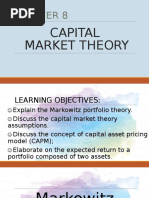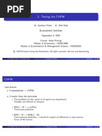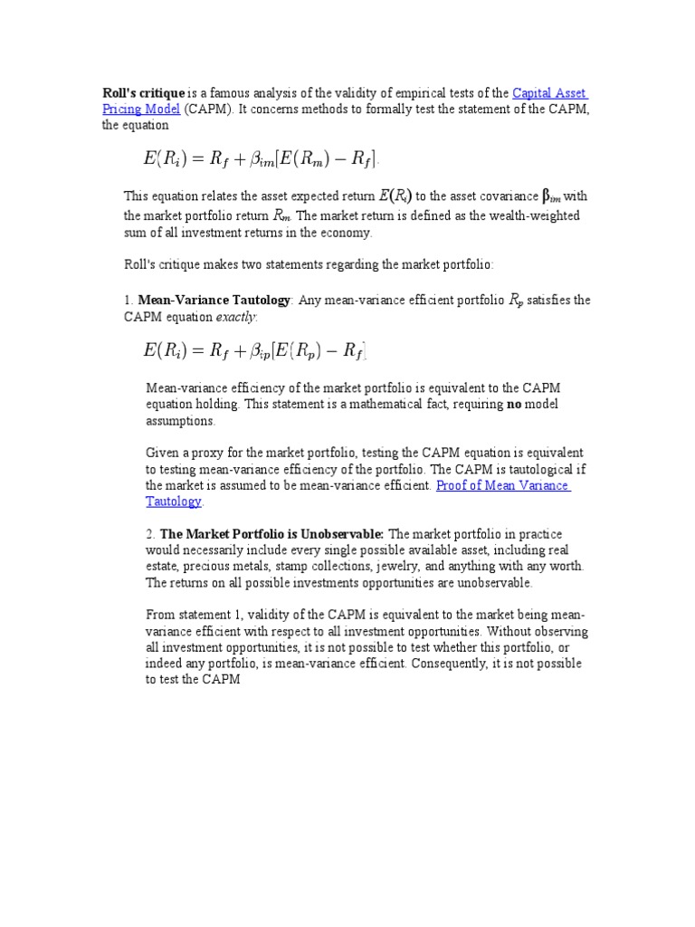 This equation relates the asset e pected return E(Ri) to the asset covariance !im "ith the mar#et portfolio return Rm. The mar#et return is defined as the "ealth$"eighted sum of all investment returns in the economy. %oll&s critique ma#es t"o statements regarding the mar#et portfolio' (. Mean-Variance Tautology' Any mean$variance efficient portfolio Rp satisfies the CAPM equation exactly' . Mean$variance efficiency of the mar#et portfolio is equivalent to the CAPM equation holding. This statement is a mathematical fact, requiring no model assumptions. )iven a pro y for the mar#et portfolio, testing the CAPM equation is equivalent to testing mean$variance efficiency of the portfolio. The CAPM is tautological if the mar#et is assumed to *e mean$variance efficient. Proof of Mean +ariance Tautology. ,. The Market Portfolio is Unobservable: The mar#et portfolio in practice "ould necessarily include every single possi*le availa*le asset, including real estate, precious metals, stamp collections, -e"elry, and anything "ith any "orth. The returns on all possi*le investments opportunities are uno*serva*le. .rom statement (, validity of the CAPM is equivalent to the mar#et *eing mean$ variance efficient "ith respect to all investment opportunities. /ithout o*serving all investment opportunities, it is not possi*le to test "hether this portfolio, or indeed any portfolio, is mean$variance efficient. Consequently, it is not possi*le to test the CAPM
