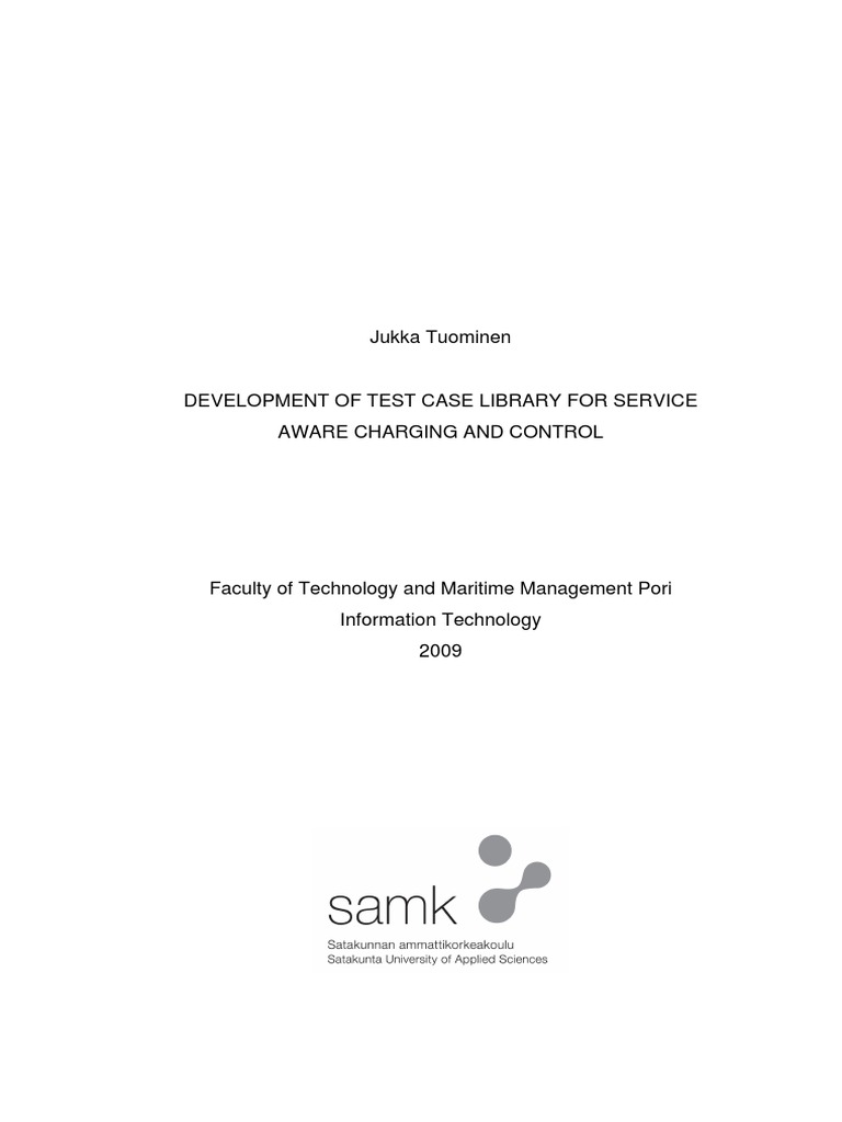 Tuominen, Jukka Satakunta University of Applied Sciences Faculty of Technology and Maritime Management Pori Information Technology Sponsored by Oy L M Ericsson Ab Instructor: [Link]. Jari Temonen Tutor: [Link]. Kirsi Koskenheimo August 2009 Supervisor: Lecturer, [Link]. Ilkka Kulmala UDC: 621.395 Number of Pages: 41 Keywords: GPRS, SACC, testing, library systems, telecommunications networks The purpose of this thesis was to improve the thesis workers competence on mobile phone network technology and develop a library system for documents generated during testing of Service Aware Charging and Control solution. Testing of mobile phone networks is performed when modifications or upgrades have been implemented to networks. Documentation for testing process is made for functions and features to be tested. Test documentary creation was planned to make easier by developing a library system within this thesis. Existing and new documents can be stored to this library. By using this documentary, stored in the library, makes test document creation easier and faster. Theory part of this thesis includes description of packet core network and description of service aware charging and control solution. It also introduces components occupied by this solution. Practical part of this thesis considers the developing process and testing of the library system. The work was successfully finished and targets been set were reached. Library system is now usable and almost all existing test documentary is stored into the library.