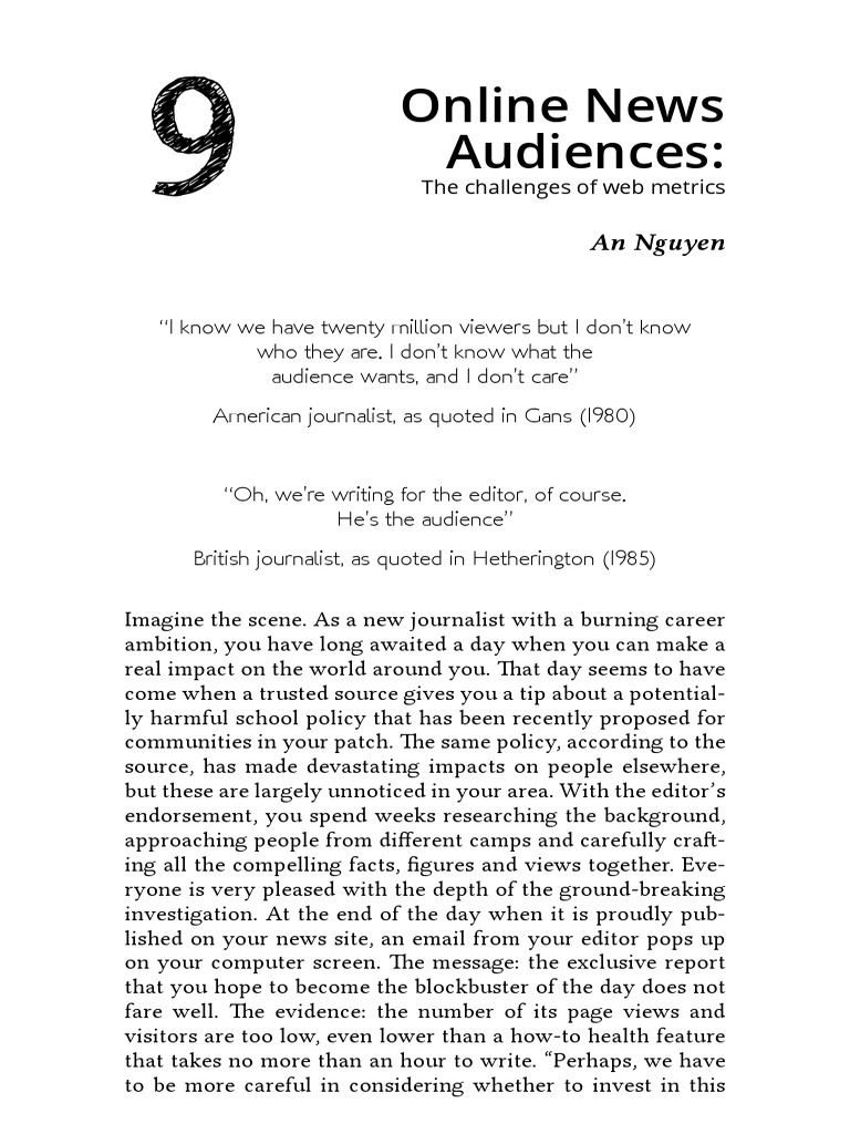 Oh, were writing for the editor, of course. Hes the audience British journalist, as quoted in Hetherington (1985) Imagine the scene. As a new journalist with a burning career ambition, you have long awaited a day when you can make a real impact on the world around you. That day seems to have come when a trusted source gives you a tip about a potentially harmful school policy that has been recently proposed for communities in your patch. The same policy, according to the source, has made devastating impacts on people elsewhere, but these are largely unnoticed in your area. With the editors endorsement, you spend weeks researching the background, approaching people from different camps and carefully crafting all the compelling facts, figures and views together. Everyone is very pleased with the depth of the ground-breaking investigation. At the end of the day when it is proudly published on your news site, an email from your editor pops up on your computer screen. The message: the exclusive report that you hope to become the blockbuster of the day does not fare well. The evidence: the number of its page views and visitors are too low, even lower than a how-to health feature that takes no more than an hour to write. Perhaps, we have to be more careful in considering whether to invest in this