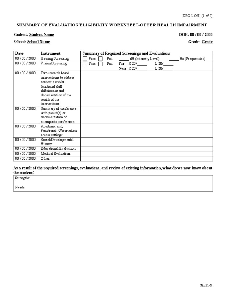 SUMMARY OF EVALUATION/ELIGIBILITY WORKSHEET-OTHER HEALTH IMPAIRMENT