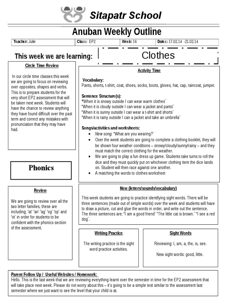 Sitapatr School Anuban Weekly Outline