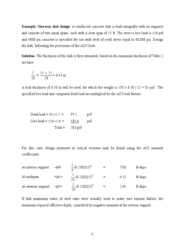 A reinforced concrete slab is built integrally with its supports and consists of two equal spans, each with a clear span of 15 ft. The service live load is 116 psf and 4000 psi concrete is specified for use with steel of yield stress equal to 60,000 psi. Design the slab, following the provisions of the ACI Code. Solution. The thickness of the slab is first estimated, based on the minimum thickness of Table 1 we have