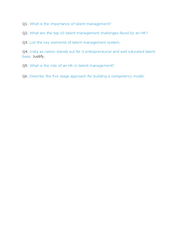 What are the top 10 talent management challenges faced by an HR? Q3. List the key elements of talent management system. Q4. India as nation stands out for it entrepreneurial and well educated talent base. Justify. Q5. What is the role of an HR in talent management? Q6. Describe the five stage approach for building a competency model.