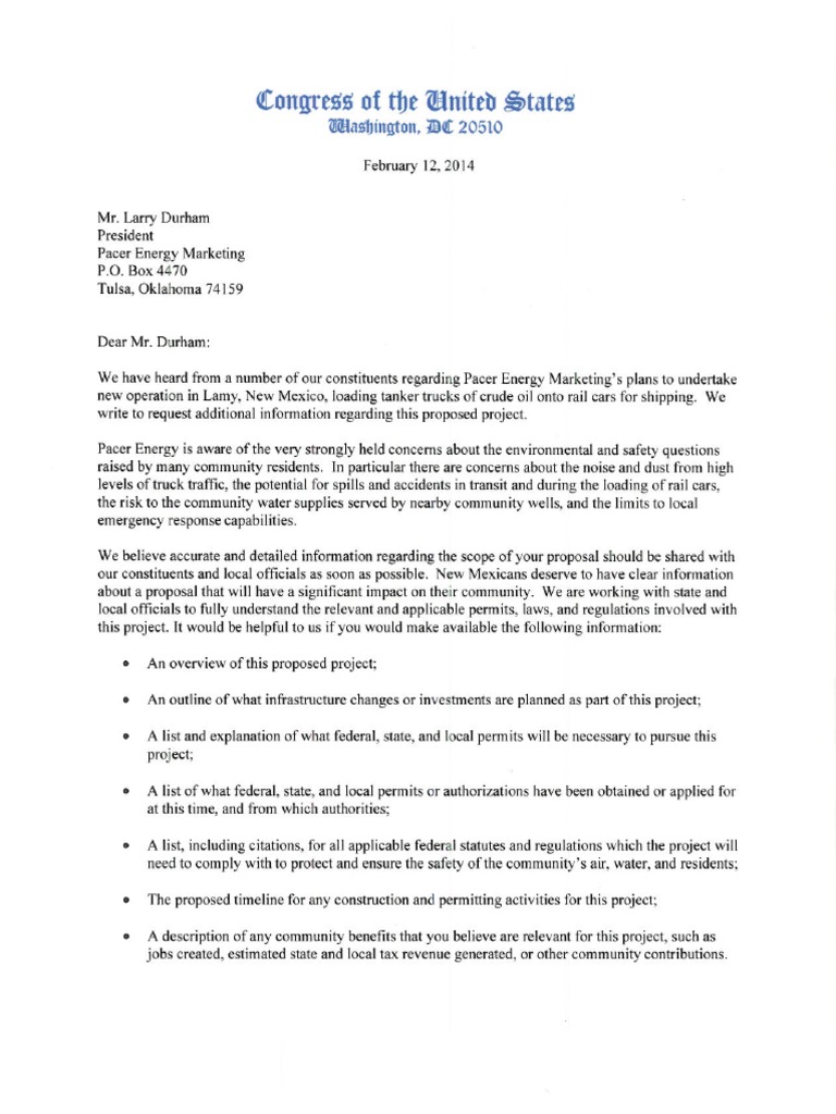 Sen. Tom Udall, Sen. Martin Heinrich and Rep. Ben Ray Lujan send a letter to Pacer Energy Marketing President Larry Durham about a proposed operation in Lamy, New Mexico.