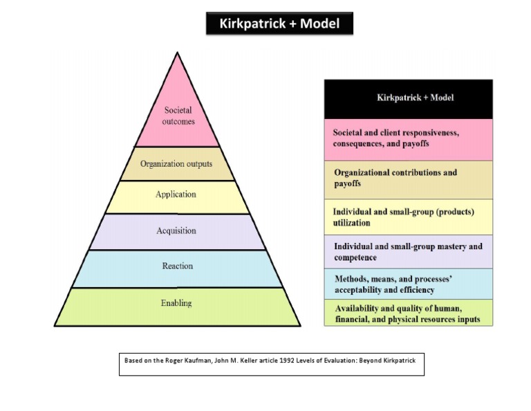 I created this representation of the Kirkpatick + Model after reading about it in an article by Roger Kaufman and John M. Keller. I think it expands the Kirkpatrick model in much needed areas that update the old model.