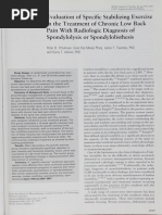 Specic spinal stabilization exercises have been shown to reduce future recurrences following an acute LBP episode (Hides et al., 2001). Specic spine stabilization exercises achieved superior outcomes to isotonic exercises in chronic patients with spondylolysthesis (OSullivan et al., 1997). One study that compared McGills general stabilization exercise approach to the Australian deep local stabilization training demonstrated that the general approach was superior (Koumantakis et al., 2005). Stuge et al. (2004) found that stabilizing exercises were superior to traditional physical therapy for pelvic girdle pain after pregnancy. The stabilization group had lower pain intensity, disability, higher quality of life, and less impairments. The results persisted at 1-year check post-partum. Yilmaz et al. (2003) administered an 8-week stabilization program to post-operative lumbar microdiscectomy patients. It was compared to home exercise and to no exercise. At the 12th week superior results were achieved in pain, function, mobility, and lifting ability for the stabilization group. Supervised stabilization training was superior to home exercises which was superior to no exercise.