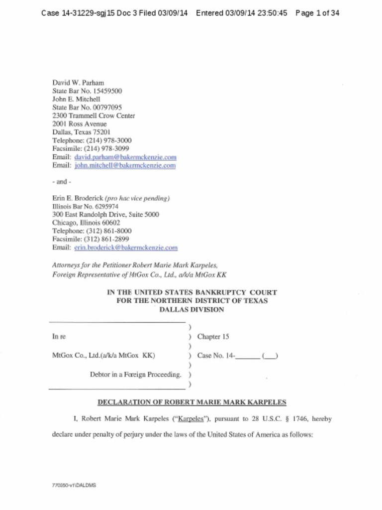 [translation] 2014 (rehabilitation) no. 12 DECISION Shibuya 2-11-5, Shibuya-ku, Tokyo Rehabilitation debtor MtGox Co., Ltd. Representative Director Robert Marie Mark Karpeles The Court acknowledges the existence of special circumstances as stipulated under Article 27.1 of the Civil Rehabilitation Law and hereby decides as follows. JUDGMENT No forced execution or preliminary attachment or disposition shall be made by a rehabilitation creditor on the basis of a rehabilitation debt with regard to the properties of the rehabilitation debtor during the period until a decision shall be made with regard to the application for commencement of civil rehabilitation. February 28, 2014 Tokyo District Court 20th Civil Chamber Head Judge Judge Judge Yasushi Kanokogi Hideki Kanazawa Masaki Higuchi