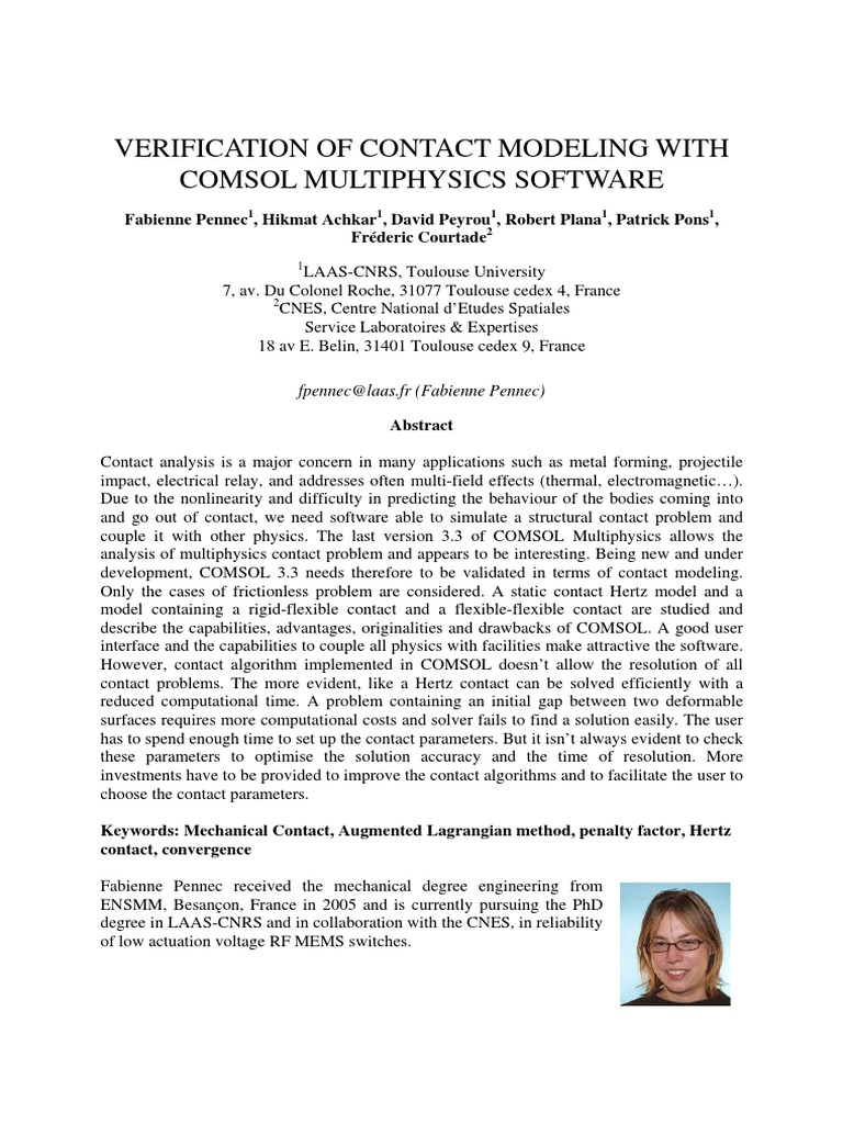 Fabienne Pennec1, Hikmat Achkar1, David Peyrou1, Robert Plana1, Patrick Pons1, Frderic Courtade2 LAAS-CNRS, Toulouse University 7, av. Du Colonel Roche, 31077 Toulouse cedex 4, France 2 CNES, Centre National dEtudes Spatiales Service Laboratoires & Expertises 18 av E. Belin, 31401 Toulouse cedex 9, France fpennec@laas.fr (Fabienne Pennec) Abstract Contact analysis is a major concern in many applications such as metal forming, projectile impact, electrical relay, and addresses often multi-field effects (thermal, electromagnetic). Due to the nonlinearity and difficulty in predicting the behaviour of the bodies coming into and go out of contact, we need software able to simulate a structural contact problem and couple it with other physics. The last version 3.3 of COMSOL Multiphysics allows the analysis of multiphysics contact problem and appears to be interesting. Being new and under development, COMSOL 3.3 needs therefore to be validated in terms of contact modeling. Only the cases of frictionless problem are considered. A static contact Hertz model and a model containing a rigid-flexible contact and a flexible-flexible contact are studied and describe the capabilities, advantages, originalities and drawbacks of COMSOL. A good user interface and the capabilities to couple all physics with facilities make attractive the software. However, contact algorithm implemented in COMSOL doesnt allow the resolution of all contact problems. The more evident, like a Hertz contact can be solved efficiently with a reduced computational time. A problem containing an initial gap between two deformable surfaces requires more computational costs and solver fails to find a solution easily. The user has to spend enough time to set up the contact parameters. But it isnt always evident to check these parameters to optimise the solution accuracy and the time of resolution. More investments have to be provided to improve the contact algorithms and to facilitate the user to choose the contact parameters. Keywords: Mechanical Contact, Augmented Lagrangian method, penalty factor, Hertz contact, convergence Fabienne Pennec received the mechanical degree engineering from ENSMM, Besanon, France in 2005 and is currently pursuing the PhD degree in LAAS-CNRS and in collaboration with the CNES, in reliability of low actuation voltage RF MEMS switches.
