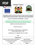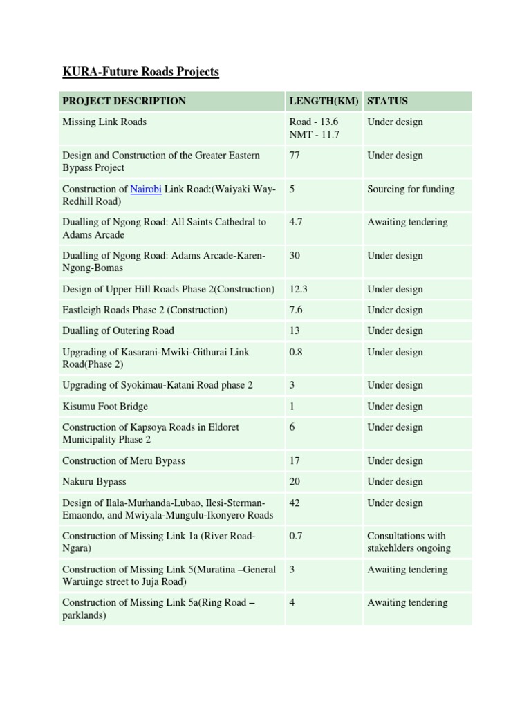 PROJECT DESCRIPTION Missing Link Roads Design and Construction of the Greater Eastern Bypass Project Construction of Nairobi Link Road:(Waiyaki WayRedhill Road) Dualling of Ngong Road: All Saints Cathedral to Adams Arcade Dualling of Ngong Road: Adams Arcade-KarenNgong-Bomas Design of Upper Hill Roads Phase 2(Construction) Eastleigh Roads Phase 2 (Construction) Dualling of Outering Road Upgrading of Kasarani-Mwiki-Githurai Link Road(Phase 2) Upgrading of Syokimau-Katani Road phase 2 Kisumu Foot Bridge Construction of Kapsoya Roads in Eldoret Municipality Phase 2 Construction of Meru Bypass Nakuru Bypass Design of Ilala-Murhanda-Lubao, Ilesi-StermanEmaondo, and Mwiyala-Mungulu-Ikonyero Roads Construction of Missing Link 1a (River RoadNgara) Construction of Missing Link 5(Muratina General Waruinge street to Juja Road) Construction of Missing Link 5a(Ring Road parklands) LENGTH(KM) STATUS Road - 13.6 NMT - 11.7 77 5 4.7 30 12.3 7.6 13 0.8 3 1 6 17 20 42 0.7 3 4 Under design Under design Sourcing for funding Awaiting tendering Under design Under design Under design Under design Under design Under design Under design Under design Under design Under design Under design Consultations with stakehlders ongoing Awaiting tendering Awaiting tendering