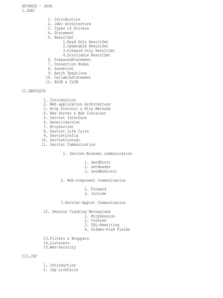 12. Session Tracking Mechanisms 1. HttpSession 2. Cookies 3. URL-Rewriting 4. Hidden-Form Fields 13.Filters & Wrappers 14.Listeners 15.Web-Security III.JSP 1. Introduction 2. Jsp LifeCycle