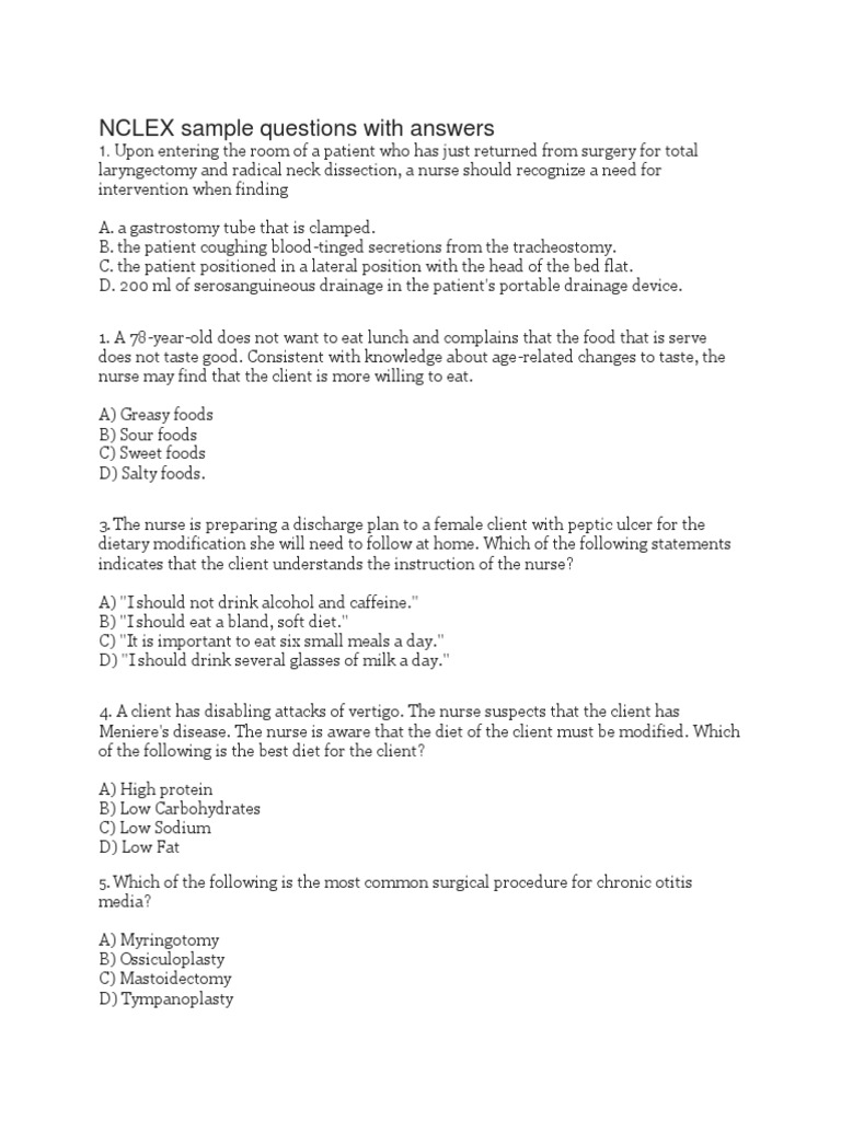 1. C. the patient positioned in a lateral position with the head of the bed flat. After total laryngectomy and radical neck dissection, a patient should be placed in a semi-Fowler's position to decrease edema and limit tension on the suture line. 2. C = the older adults' taste buds retain their sensitivity to carbohydrates. In addition, carbohydrates. Tend to be food items that are easy to chew. Older adults lose their sensitivity to sour and salty foods. Older adults may find greasy foods harder to digest and therefore may avoid them; however, preference for greasy foods is not related to changes in taste associated with age. 3. A = caffeinated beverages and alcohol should be avoided because they stimulate gastric acid production and irritate gastric mucosa. The client should avoid foods that cause discomfort; however, there is no need to follow a soft, bland diet. Eating six small meals daily is no longer a common treatment for peptic ulcer disease. Milk in large quantities is not recommended because it actually stimulates further production of gastric acids.