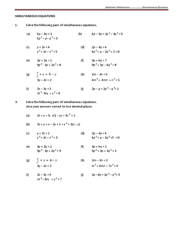 SIMULTANEOUS EQUATIONS 1. Solve the following pairs of simultaneous equations, (a) 5p 3q = 2 5p 2 p q 2 = 3 y + 2x = 4 y 2 + 2x x 2 = 5 3p + 2q = 1 9p 2 - 3p + 2q 2 = 8 (b) 4p 3 q = 2 p 2 3q 2 = 5