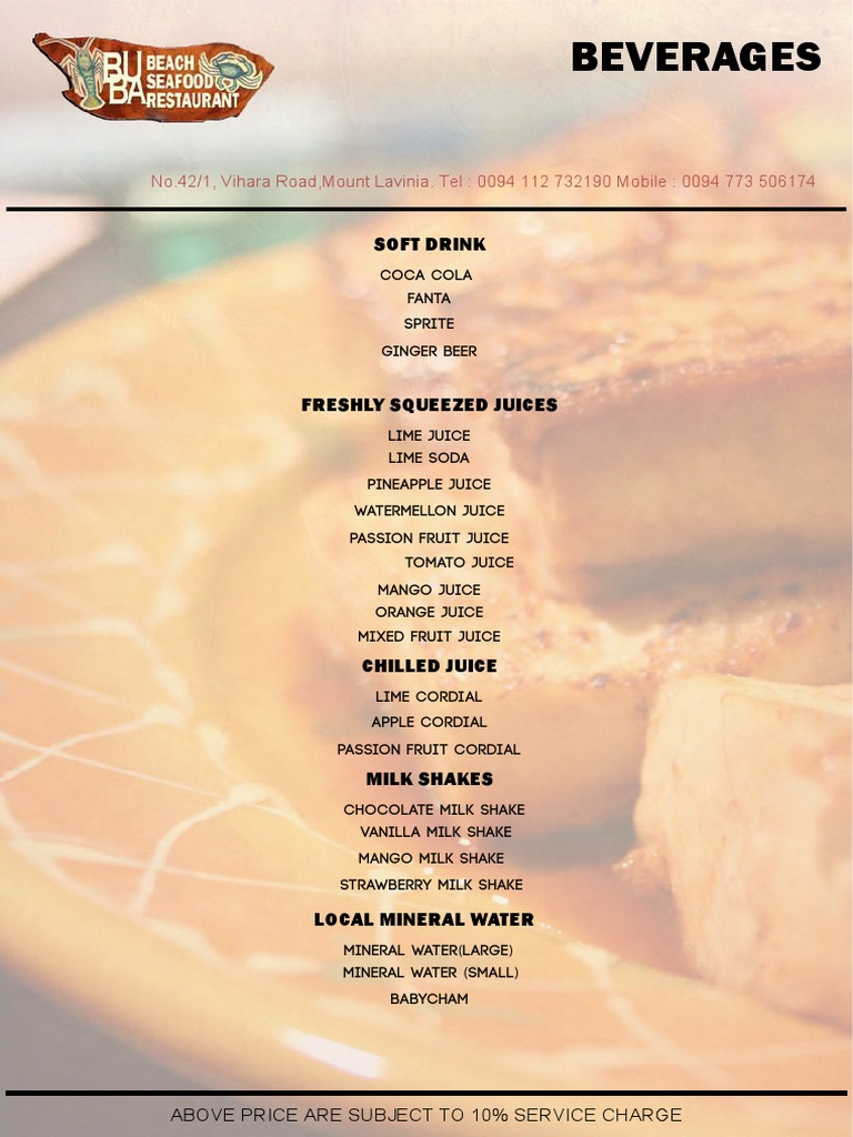 LIME JUICE LIME SODA PINEAPPLE JUICE WATERMELLON JUICE PASSION FRUIT JUICE TOMATO JUICE MANGO JUICE ORANGE JUICE MIXED FRUIT JUICE