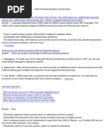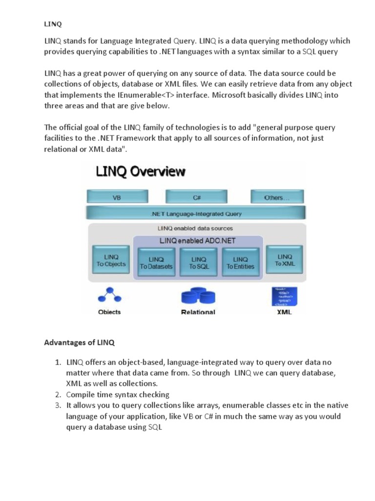 LINQ to XML (XLinq) { Queries performed against the XML source} LINQ to Objects deals with in-memory data. Any class that implements the IEnumerable<T> interface (in the System.Collections.Generic namespace) can be queried with SQO. LINQ to ADO.NET deals with data from external sources, basically anything ADO.NET can connect to. Any class that implements IEnumerable<T> or IQueryable<T> (in the System.Query namespace) can be queried with SQO.