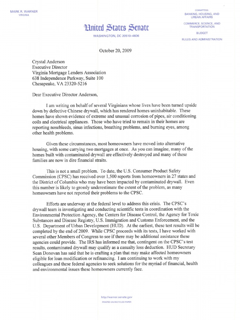 U.S. Sen. Mark Warner sent a letter to banks and mortgage lenders on October 20, 2009, urging them to work cooperatively with Virginia families dealing with health and safety issues linked to the use of Chinese drywall. Senator Warner’s office is working with at least 51 southeastern Virginia families who report a range of similar problems with structural corrosion and odors, as well as many common health concerns, including headaches, burning eyes and nosebleeds.