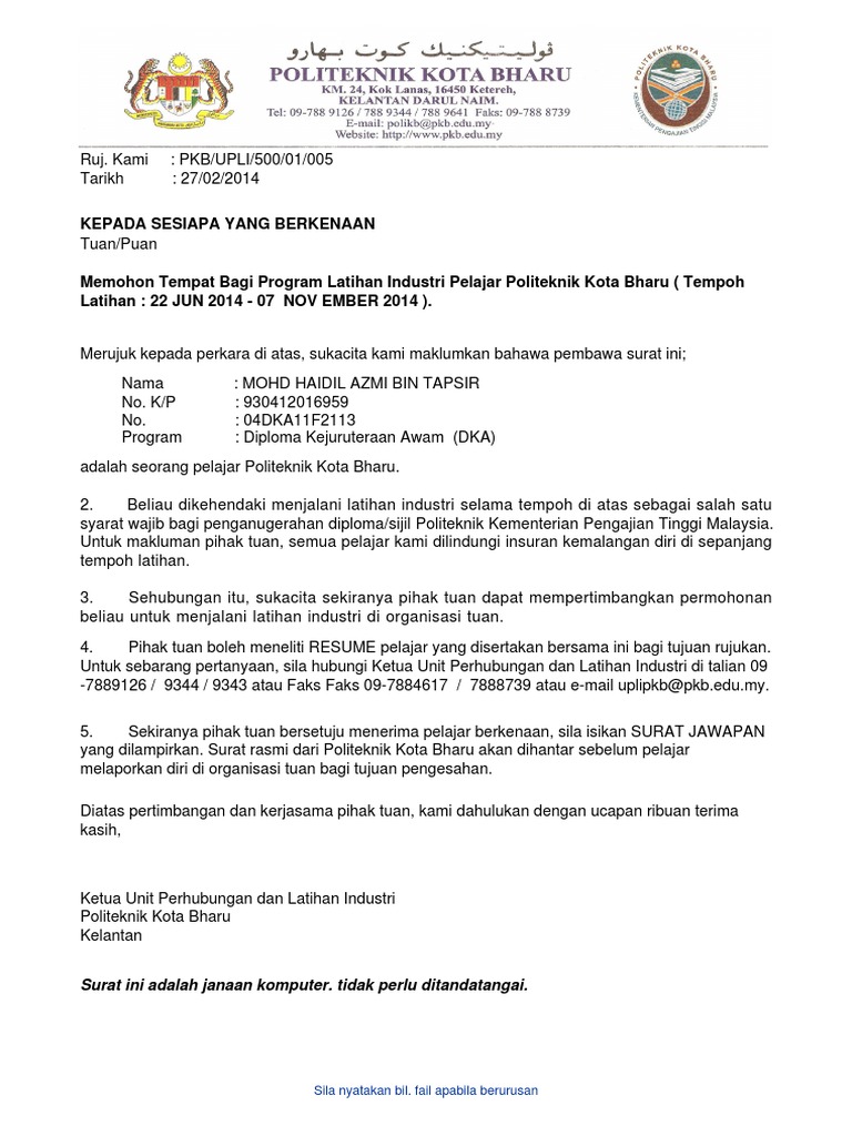 adalah seorang pelajar Politeknik Kota Bharu. 2. Beliau dikehendaki menjalani latihan industri selama tempoh di atas sebagai salah satu syarat wajib bagi penganugerahan diploma/sijil Politeknik Kementerian Pengajian Tinggi Malaysia. Untuk makluman pihak tuan, semua pelajar kami dilindungi insuran kemalangan diri di sepanjang tempoh latihan. 3. Sehubungan itu, sukacita sekiranya pihak tuan dapat mempertimbangkan permohonan beliau untuk menjalani latihan industri di organisasi tuan. 4. Pihak tuan boleh meneliti RESUME pelajar yang disertakan bersama ini bagi tujuan rujukan. Untuk sebarang pertanyaan, sila hubungi Ketua Unit Perhubungan dan Latihan Industri di talian 09 -7889126 / 9344 / 9343 atau Faks Faks 09-7884617 / 7888739 atau e-mail uplipkb@pkb.edu.my. 5. Sekiranya pihak tuan bersetuju menerima pelajar berkenaan, sila isikan SURAT JAWAPAN yang dilampirkan. Surat rasmi dari Politeknik Kota Bharu akan dihantar sebelum pelajar melaporkan diri di organisasi tuan bagi tujuan pengesahan. Diatas pertimbangan dan kerjasama pihak tuan, kami dahulukan dengan ucapan ribuan terima kasih,