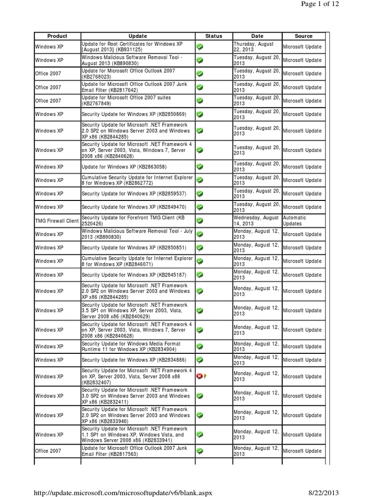 Update Update for Root Certificates for Windows XP [August 2013] (KB931125) Windows Malicious Software Removal Tool August 2013 (KB890830) Update for Microsoft Office Outlook 2007 (KB2768023) Update for Microsoft Office Outlook 2007 Junk Email Filter (KB2817642) Update for Microsoft Office 2007 suites (KB2767849) Security Update for Windows XP (KB2850869) Security Update for Microsoft .NET Framework 2.0 SP2 on Windows Server 2003 and Windows XP x86 (KB2844285) Security Update for Microsoft .NET Framework 4 on XP, Server 2003, Vista, Windows 7, Server 2008 x86 (KB2840628) Update for Windows XP (KB2863058) Cumulative Security Update for Internet Explorer 8 for Windows XP (KB2862772) Security Update for Windows XP (KB2859537) Security Update for Windows XP (KB2849470) Security Update for Forefront TMG Client (KB 2520426) Windows Malicious Software Removal Tool - July 2013 (KB890830) Security Update for Windows XP (KB2850851) Cumulative Security Update for Internet Explorer 8 for Windows XP (KB2846071) Security Update for Windows XP (KB2845187) Security Update for Microsoft .NET Framework 2.0 SP2 on Windows Server 2003 and Windows XP x86 (KB2844285) Security Update for Microsoft .NET Framework 3.5 SP1 on Windows XP, Server 2003, Vista, Server 2008 x86 (KB2840629) Security Update for Microsoft .NET Framework 4 on XP, Server 2003, Vista, Windows 7, Server 2008 x86 (KB2840628) Security Update for Windows Media Format Runtime 11 for Windows XP (KB2834904) Security Update for Windows XP (KB2834886) Security Update for Microsoft .NET Framework 4 on XP, Server 2003, Vista, Server 2008 x86 (KB2832407) Security Update for Microsoft .NET Framework 3.0 SP2 on Windows Server 2003 and Windows XP x86 (KB2832411) Security Update for Microsoft .NET Framework 2.0 SP2 on Windows Server 2003 and Windows XP x86 (KB2833940) Security Update for Microsoft .NET Framework 1.1 SP1 on Windows XP, Windows Vista, and Windows Server 2008 x86 (KB2833941) Update for Microsoft Office Outlook 2007 Junk Email Filter (KB2817563)