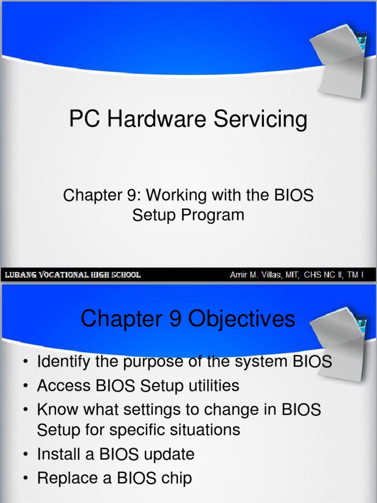 Identify the purpose of the system BIOS Access BIOS Setup utilities Know what settings to change in BIOS Setup for specific situations Install a BIOS update Replace a BIOS chip