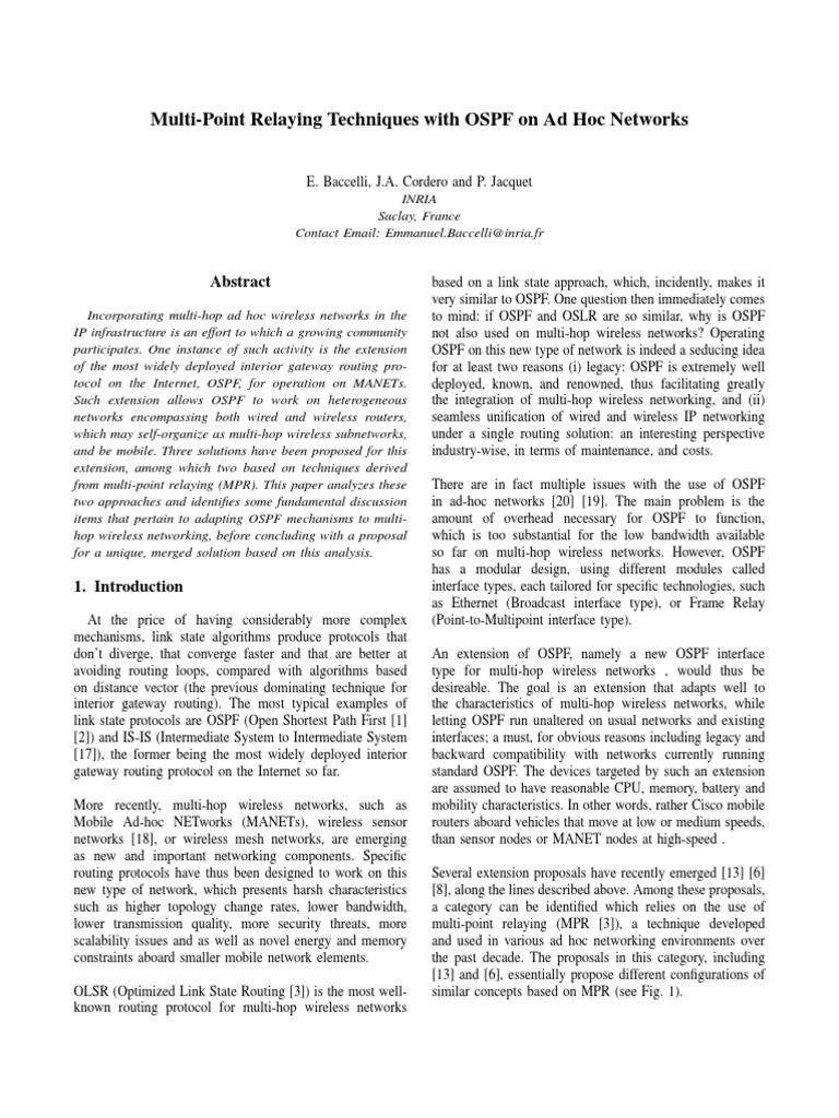 based on a link state approach, which, incidently, makes it very similar to OSPF. One question then immediately comes to mind: if OSPF and OSLR are so similar, why is OSPF not also used on multi-hop wireless networks? Operating OSPF on this new type of network is indeed a seducing idea for at least two reasons (i) legacy: OSPF is extremely well deployed, known, and renowned, thus facilitating greatly the integration of multi-hop wireless networking, and (ii) seamless unication of wired and wireless IP networking under a single routing solution: an interesting perspective industry-wise, in terms of maintenance, and costs. There are in fact multiple issues with the use of OSPF in ad-hoc networks [20] [19]. The main problem is the amount of overhead necessary for OSPF to function, which is too substantial for the low bandwidth available so far on multi-hop wireless networks. However, OSPF has a modular design, using different modules called interface types, each tailored for specic technologies, such as Ethernet (Broadcast interface type), or Frame Relay (Point-to-Multipoint interface type). An extension of OSPF, namely a new OSPF interface type for multi-hop wireless networks , would thus be desireable. The goal is an extension that adapts well to the characteristics of multi-hop wireless networks, while letting OSPF run unaltered on usual networks and existing interfaces; a must, for obvious reasons including legacy and backward compatibility with networks currently running standard OSPF. The devices targeted by such an extension are assumed to have reasonable CPU, memory, battery and mobility characteristics. In other words, rather Cisco mobile routers aboard vehicles that move at low or medium speeds, than sensor nodes or MANET nodes at high-speed . Several extension proposals have recently emerged [13] [6] [8], along the lines described above. Among these proposals, a category can be identied which relies on the use of multi-point relaying (MPR [3]), a technique developed and used in various ad hoc networking environments over the past decade. The proposals in this category, including [13] and [6], essentially propose different congurations of similar concepts based on MPR (see Fig. 1).