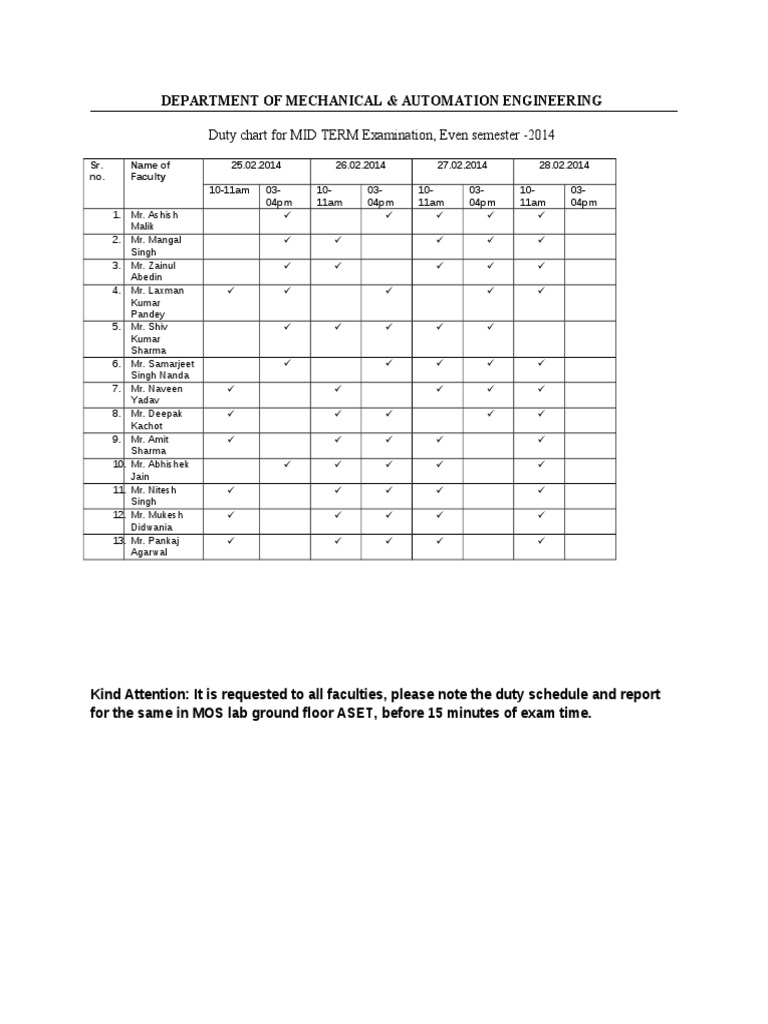 DEPARTMENT OF MECHANICAL & AUTOMATION ENGINEERING Duty chart for MID TERM Examination, Even semester -2014