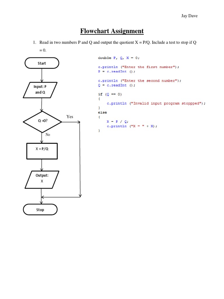 1. Read in two numbers P and Q and output the quotient X = P/Q. Include a test to stop if Q = 0.