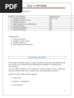 Setup > Options > Financials Description: Use the Financials Options window to define the options and defaults used for Oracle Financial Application(s). Values entered in this window are shared by Oracle Payables, Oracle Purchasing, and Oracle Assets. Defaults can be defined in this window to simplify supplier entry, requisition entry, purchase order entry, invoice entry, and automatic payments. Depending on the application, you may not be required to enter all fields. Although you only need to define these options and defaults once, you can update them at any time. If you change an option and it is used as a default value elsewhere in the system, it will only be used as a default for subsequent transactions. For example, if you change the Payment Terms from Immediate to Net 30, Net 30 will be used as a default for any new suppliers you enter, but the change will not affect the Payment Terms of existing suppliers.