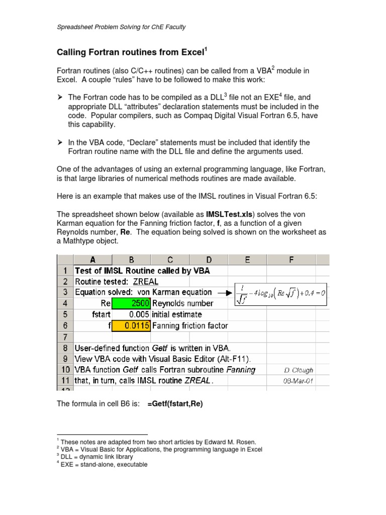 Fortran routines (also C/C++ routines) can be called from a VBA2 module in Excel. A couple rules have to be followed to make this work: The Fortran code has to be compiled as a DLL3 file not an EXE4 file, and appropriate DLL attributes declaration statements must be included in the code. Popular compilers, such as Compaq Digital Visual Fortran 6.5, have this capability. In the VBA code, Declare statements must be included that identify the Fortran routine name with the DLL file and define the arguments used. One of the advantages of using an external programming language, like Fortran, is that large libraries of numerical methods routines are made available. Here is an example that makes use of the IMSL routines in Visual Fortran 6.5: The spreadsheet shown below (available as [Link]) solves the von Karman equation for the Fanning friction factor, f, as a function of a given Reynolds number, Re. The equation being solved is shown on the worksheet as a Mathtype object.