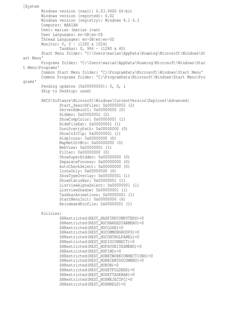 1 6.3 Computer: MARIAN User: marian (marian ivan) User Languages: en-GB|en-US Thread Languages: en-GB|en|en-US Monitor: 0, 0 - (1280 x 1024) Taskbar: 0, 984 - (1280 x 40) Start Menu folder: 'C:\Users\marian\AppData\Roaming\Microsoft\Windows\St art Menu' Programs folder: 'C:\Users\marian\AppData\Roaming\Microsoft\Windows\Star t Menu\Programs' Common Start Menu folder: 'C:\ProgramData\Microsoft\Windows\Start Menu' Common Programs folder: 'C:\ProgramData\Microsoft\Windows\Start Menu\Pro grams' Pending updates (0x00000000): 0, 0, 1 Skip to Desktop: unset HKCU\Software\Microsoft\Windows\CurrentVersion\Explorer\Advanced: Start_SearchFiles: 0x00000002 (2) ServerAdminUI: 0x00000000 (0) Hidden: 0x00000002 (2) ShowCompColor: 0x00000001 (1) HideFileExt: 0x00000001 (1) DontPrettyPath: 0x00000000 (0) ShowInfoTip: 0x00000001 (1) HideIcons: 0x00000000 (0) MapNetDrvBtn: 0x00000000 (0) WebView: 0x00000001 (1) Filter: 0x00000000 (0) ShowSuperHidden: 0x00000000 (0) SeparateProcess: 0x00000000 (0) AutoCheckSelect: 0x00000000 (0) IconsOnly: 0x00000000 (0) ShowTypeOverlay: 0x00000001 (1) ShowStatusBar: 0x00000001 (1) ListviewAlphaSelect: 0x00000001 (1) ListviewShadow: 0x00000001 (1) TaskbarAnimations: 0x00000001 (1) StartMenuInit: 0x00000006 (6) ReindexedProfile: 0x00000001 (1) Policies: SHRestricted(REST_HASFINDCOMPUTERS)=0 SHRestricted(REST_NOCHANGESTARMENU)=0 SHRestricted(REST_NOCLOSE)=0 SHRestricted(REST_NOCOMMONGROUPS)=0 SHRestricted(REST_NOCONTROLPANEL)=0 SHRestricted(REST_NODISCONNECT)=0 SHRestricted(REST_NOFAVORITESMENU)=0 SHRestricted(REST_NOFIND)=0 SHRestricted(REST_NONETWORKCONNECTIONS)=0 SHRestricted(REST_NORECENTDOCSMENU)=0 SHRestricted(REST_NORUN)=0 SHRestricted(REST_NOSETFOLDERS)=0 SHRestricted(REST_NOSETTASKBAR)=0 SHRestricted(REST_NOSMEJECTPC)=0 SHRestricted(REST_NOSMHELP)=0