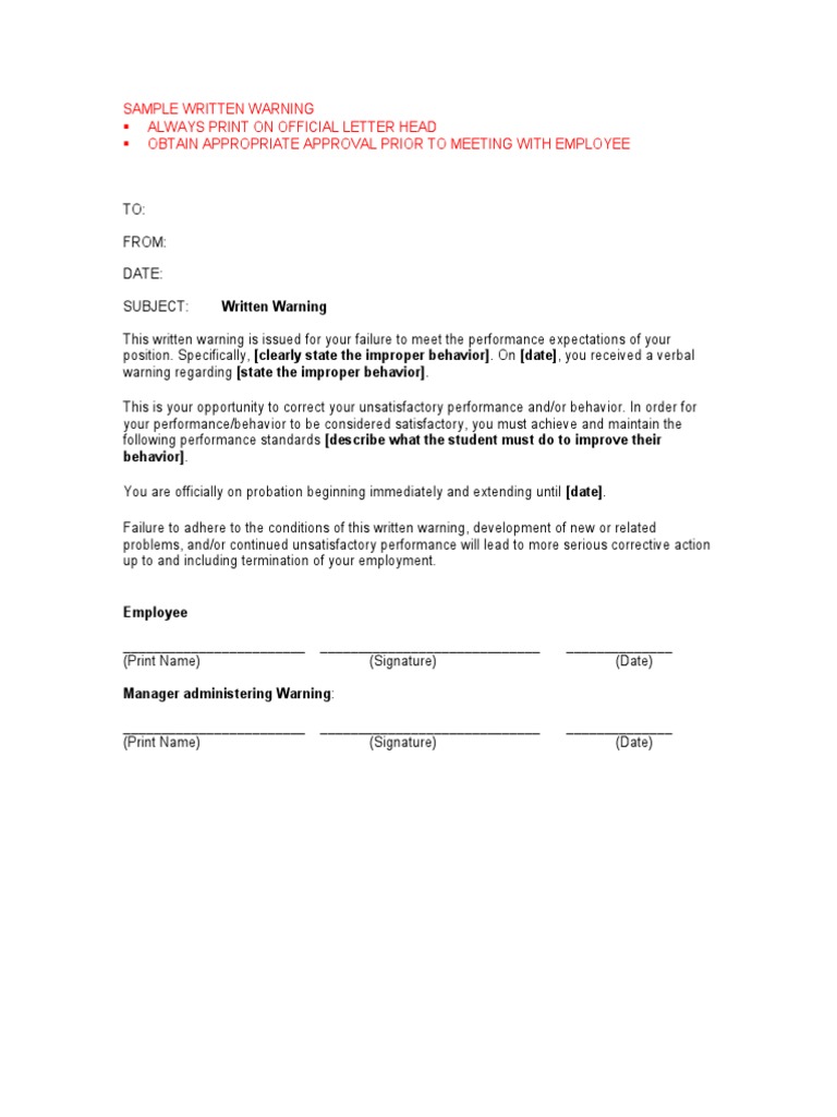 SAMPLE WRITTEN WARNING