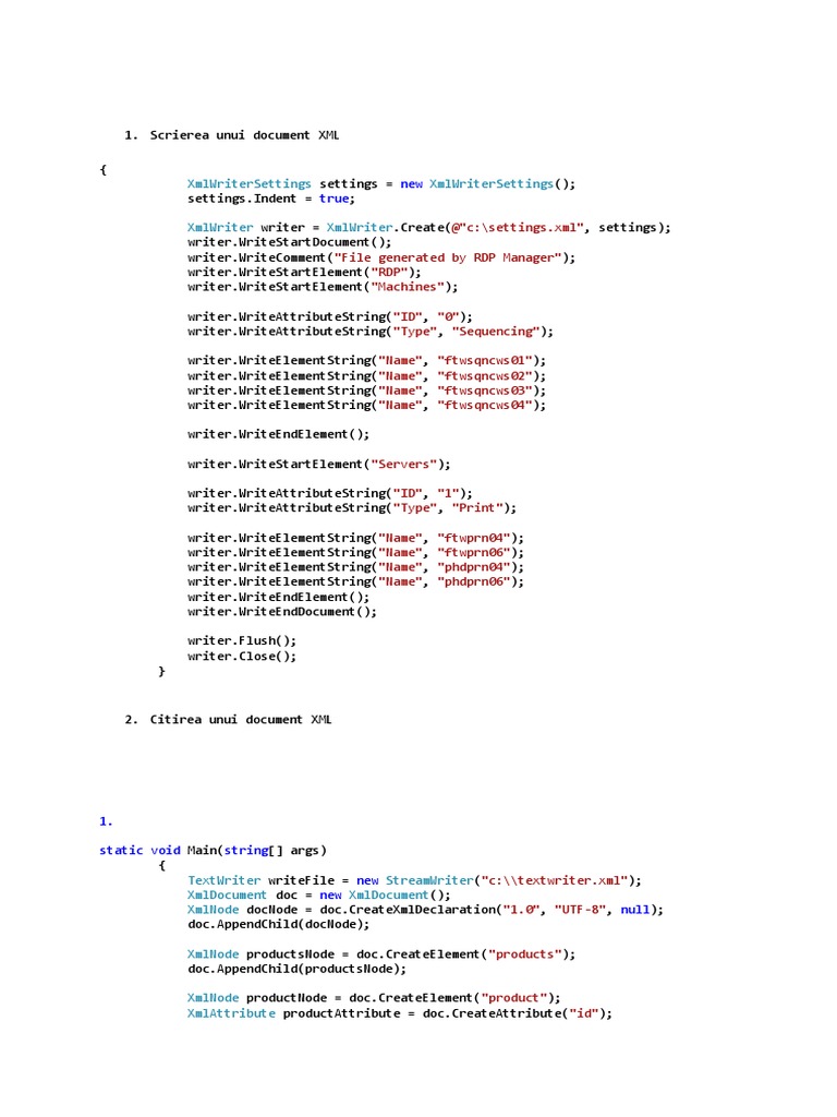 1. Scrierea unui document XML { XmlWriterSettings settings = new XmlWriterSettings(); [Link] = true; XmlWriter writer = [Link](@"c:\[Link]", settings); writer.