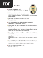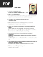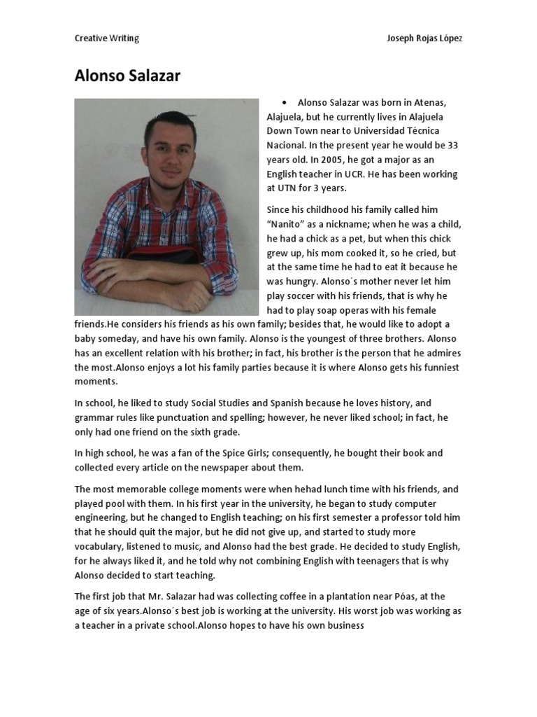 Alonso Salazar was born in Atenas, Alajuela, but he currently lives in Alajuela Down Town near to Universidad Tcnica Nacional. In the present year he would be 33 years old. In 2005, he got a major as an English teacher in UCR. He has been working at UTN for 3 years. Since his childhood his family called him Nanito as a nickname; when he was a child, he had a chick as a pet, but when this chick grew up, his mom cooked it, so he cried, but at the same time he had to eat it because he was hungry. Alonsos mother never let him play soccer with his friends, that is why he had to play soap operas with his female friends.He considers his friends as his own family; besides that, he would like to adopt a baby someday, and have his own family. Alonso is the youngest of three brothers. Alonso has an excellent relation with his brother; in fact, his brother is the person that he admires the most.Alonso enjoys a lot his family parties because it is where Alonso gets his funniest moments. In school, he liked to study Social Studies and Spanish because he loves history, and grammar rules like punctuation and spelling; however, he never liked school; in fact, he only had one friend on the sixth grade. In high school, he was a fan of the Spice Girls; consequently, he bought their book and collected every article on the newspaper about them. The most memorable college moments were when hehad lunch time with his friends, and played pool with them. In his first year in the university, he began to study computer engineering, but he changed to English teaching; on his first semester a professor told him that he should quit the major, but he did not give up, and started to study more vocabulary, listened to music, and Alonso had the best grade. He decided to study English, for he always liked it, and he told why not combining English with teenagers that is why Alonso decided to start teaching. The first job that Mr. Salazar had was collecting coffee in a plantation near Pas, at the age of six years.Alonsos best job is working at the university. His worst job was working as a teacher in a private school.Alonso hopes to have his own business