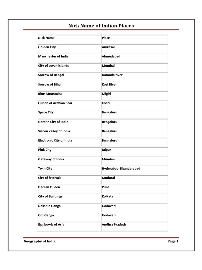 Nick Name Golden City Manchester of India City of seven islands Sorrow of Bengal Sorrow of Bihar Blue Mountains #ueen of Arabian Sear S$ace City Garden City of India Silicon valley of India %lectronic City of India Pink City Gateway of India 'win City City of festivals eccan #ueen City of Buildings akshin Ganga *ld Ganga %gg bowls of Asia Place Amritsar Ahmedabad Mumbai amoda river !osi "iver Nilgiri !ochi Bengaluru Bengaluru Bengaluru Bengaluru &ai$ur Mumbai (yderabad)Sikandarabad Mudurai Pune !olkata Godavari Godavari Andhra Pradesh
