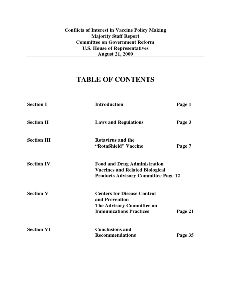 Section I Introduction Page 1Section II Laws and Regulations Page 3Section III Rotavirus and the“RotaShield” Vaccine Page 7Section IV Food and Drug AdministrationVaccines and Related BiologicalProducts Advisory Committee Page 12Section V Centers for Disease Controland PreventionThe Advisory Committee onImmunizations Practices Page 21Section VI Conclusions andRecommendations Page 35