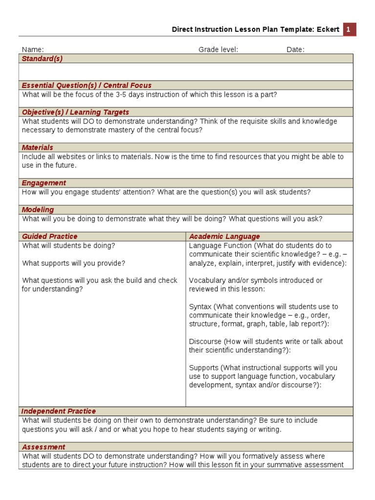 Direct Instruction Lesson Plan Template: Eckert 1 Name: Standard(s) Grade level: Date: