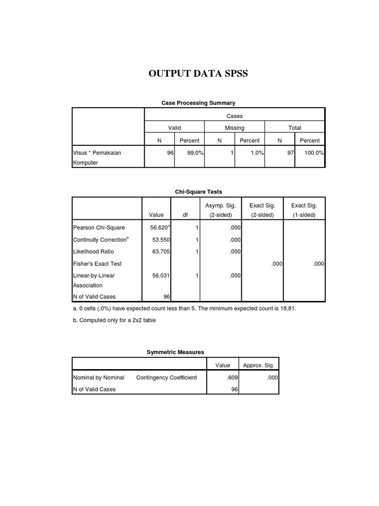 Case Processing Summary Cases Valid N Visus * Pemakaian Komputer 96 Percent 99.0% N 1 Missing Percent 1.0% N 97 Total Percent 100.0%
