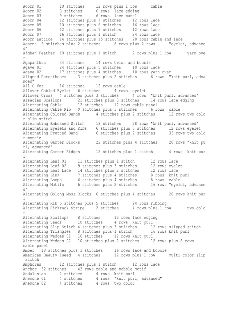 panel Acorn 04 12 stitches plus 7 stitches 12 rows lace Acorn 05 10 stitches plus 6 stitches 16 rows lace Acorn 06 12 stitches plus 7 stitches 12 rows lace Acorn 07 16 stitches plus 1 stitch 24 rows lace Acorn Lattice 14 stitches plus 15 stitches 20 rows cable and lace Acorns 6 stitches plus 2 stitches 8 rows plus 2 rows "eyelet, advance d" Afghan Feather 10 stitches plus 1 stitch 2 rows plus 1 row yarn ove r Agapanthus 24 stitches 14 rows twist and bobble Agave 01 24 stitches plus 5 stitches 10 rows lace Agave 02 17 stitches plus 4 stitches 10 rows yarn over Aligned Parentheses 3 stitches plus 2 stitches 6 rows "knit purl, adva nced" All O Ver 16 stitches 12 rows cable Allover Cabled Eyelet 6 stitches 4 rows eyelet Allover Cross 4 stitches plus 3 stitches 4 rows "knit purl, advanced" Alsacian Scallops 21 stitches plus 3 stitches 14 rows lace edging Alternating Cable 12 stitches 12 rows cable panel Alternating Cable Rib 9 stitches plus 3 stitches 6 rows cable Alternating Colored Bands 4 stitches plus 2 stitches 12 rows two colo r slip stitch Alternating Embossed Stitch 18 stitches 28 rows "knit purl, advanced" Alternating Eyelets and Ribs 6 stitches plus 5 stitches 12 rows eyelet Alternating Fretted Band 6 stitches plus 2 stitches 36 rows two colo r mosaic Alternating Garter Blocks 22 stitches plus 4 stitches 20 rows "knit pu rl, advanced" Alternating Garter Ridges 12 stitches plus 1 stitch 4 rows knit pur l Alternating Leaf 01 11 stitches plus 1 stitch 12 rows lace Alternating Leaf 02 9 stitches plus 3 stitches 12 rows eyelet Alternating Leaf Lace 14 stitches plus 2 stitches 12 rows lace Alternating Link 7 stitches plus 4 stitches 8 rows knit purl Alternating Loops 6 stitches plus 4 stitches 8 rows cable Alternating Motifs 6 stitches plus 2 stitches 16 rows "eyelet, advance d" Alternating Oblong Moss Blocks 6 stitches plus 4 stitches 20 rows knit pur l Alternating Rib 6 stitches plus 5 stitches 24 rows ribbing Alternating Rickrack Stripe 2 stitches 4 rows plus 1 row two colo r Alternating Scallops 8 stitches 12 rows lace edging Alternating Seeds 10 stitches 4 rows knit purl Alternating Slip Stitch 4 stitches plus 3 stitches 12 rows slipped stitch Alternating Triangles 8 stitches plus 1 stitch 16 rows knit purl Alternating Wedges 01 16 stitches 12 rows knit purl Alternating Wedges 02 10 stitches plus 2 stitches 12 rows plus 8 rows cable panel Amber 18 stitches plus 3 stitches 16 rows lace and bobble American Beauty Tweed 4 stitches 12 rows plus 1 row multi-color slip stitch Amphoras 12 stitches plus 1 stitch 12 rows lace Anchor 32 stitches 42 rows cable and bobble motif Andalusian 2 stitches 4 rows knit purl Anemone 01 4 stitches 4 rows "knit purl, advanced" Anemone 02 4 stitches 4 rows two color