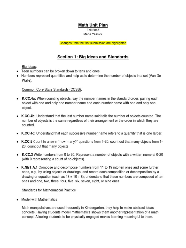 Daily Reflection: (this section will be blank in the rough draft of your unit) This lesson went very well! Instead of doing three centers at a time I split the students in half and I taught the teen number trains and my mentor teacher did estimation. I made a couple of changes; instead of using marshmallows I used unifix cubes and math chips. I wanted them to be able to estimate twice so they got the practice of changing their answer when the objects were different sizes. While I did not see them estimating in person based on their chart (another component I added to continue to get them writing teen numbers) it seemed that they understood! My focus was on the teen number trains. I decided to laminate the teen number trains so the children could have a lot of practice representing various numbers while being able to use the same form. Therefore, I handed each of them a tissue and a dry erase and asked them to represent different numbers. I cut the part where they represented the teen numbers in different ways because I wanted to have time for meaningful conversation. The conversation that we had went way better than my first lesson on the group of ten concept. I started the center by saying, Why would there be two ten frames when we represent teen numbers? Together the students figured about that the teen numbers are higher than ten so they needed two. One boy even went on to say that the extra ones go in the second frame. In addition when we talked about the number 12 the students noticed that there were two extra ones. Overall I think they are getting the extra ones part, but the 1 group of ten is still confusing. They do not understand that the ten dots in the first frame as a whole is one group unless I prompt them and say 11 has one group of.and they respond ten! I plan on continuing to discuss this concept during calendar when we talk about how many days we have been in school, but I also need to realize that this concept and objective is an extension for most students at this time.