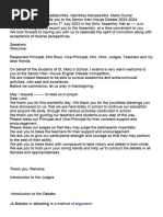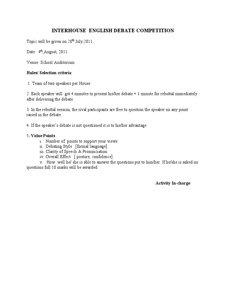 Topic will be given on 20th July,2011. Date: 4th,August, 2011. Venue: School Au ito!iu" Rules/ Selection criteria 1. Tea" o# two spea$e!s pe! %ouse 2. &ach spea$e! will get 4 "inutes to p!esent his'he! ebate ( 1 "inute #o! !ebuttal i""e iately a#te! elive!ing the ebate. ). *n the !ebuttal session, the !ival pa!ticipants a!e #!ee to +uestion the spea$e! on any point !aise in the ebate. 4. *# the spea$e!,s ebate is not +uestione it is to his'he! a vantage. -. alue Points i. .u"be! o# points to suppo!t you! views ii. Debating Style /#o!"al language0 iii. 1la!ity o# Speech 2 3!onunciation iv. 4ve!all &##ect / postu!e, con#i ence0 v. %ow well he' she is able to answe! the +uestions put to hi"'he!. *# he'she is as$e no +uestions #ull 10 "a!$s will be awa! e . Acti!it" In#c$ar%e