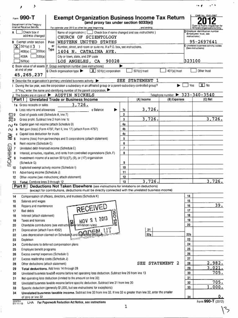 Church of Scientology Western United States, IRS 990-T, 2012