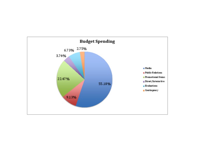 The budget allocates spending across 7 categories: Media (22.47%), Direct/Interactive (55.18%), Public Relations (6.73%), Promotional Items (2.75%), Evaluations (3.74%), Assistant (9.13%), and Contingency (3.74%). The two largest portions are allocated to Direct/Interactive activities and Media efforts. Smaller amounts are designated for Public Relations, Promotional Items, Evaluations, an Assistant, and a Contingency fund.