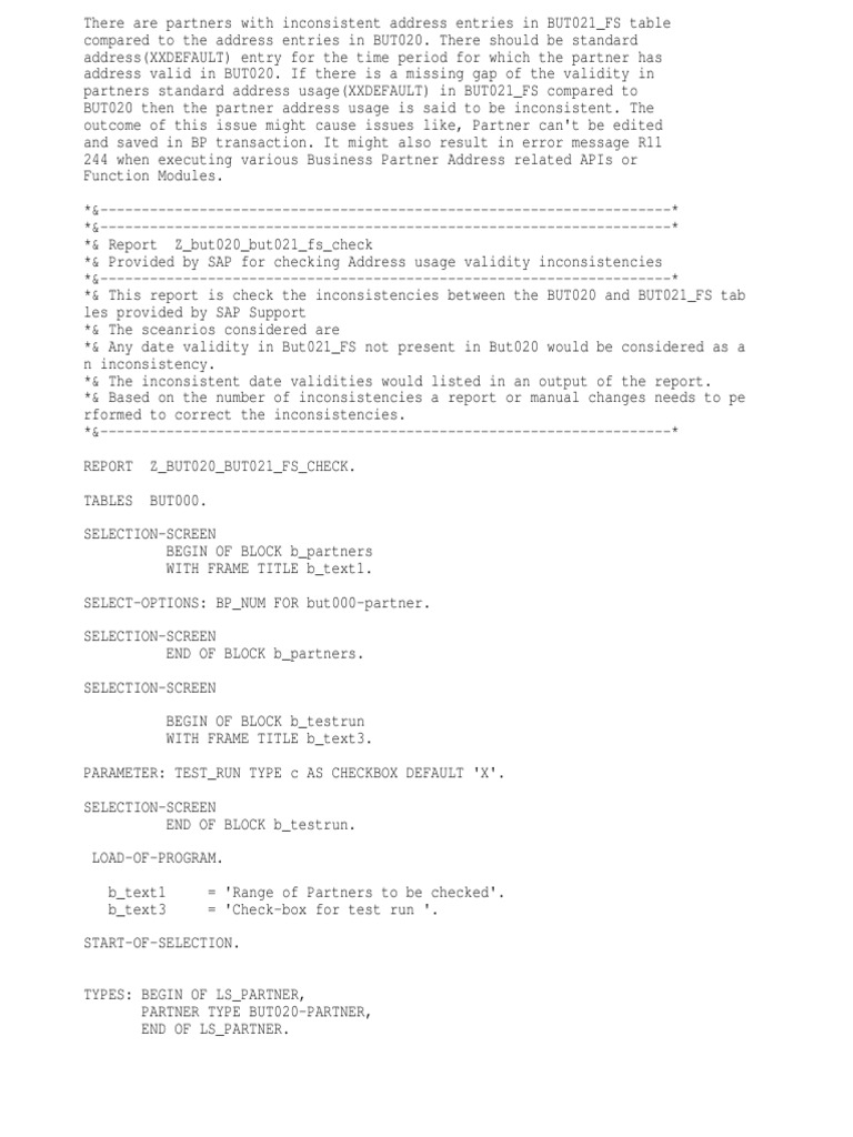 There should be standard address(XXDEFAULT) entry for the time period for which the partner has address valid in BUT020. If there is a missing gap of the validity in partners standard address usage(XXDEFAULT) in BUT021_FS compared to BUT020 then the partner address usage is said to be inconsistent. The outcome of this issue might cause issues like, Partner can't be edited and saved in BP transaction. It might also result in error message R11 244 when executing various Business Partner Address related APIs or Function Modules. *&---------------------------------------------------------------------* *&---------------------------------------------------------------------* *& Report Z_but020_but021_fs_check *& Provided by SAP for checking Address usage validity inconsistencies *&---------------------------------------------------------------------* *& This report is check the inconsistencies between the BUT020 and BUT021_FS tab les provided by SAP Support *& The sceanrios considered are *& Any date validity in But021_FS not present in But020 would be considered as a n inconsistency. *& The inconsistent date validities would listed in an output of the report. *& Based on the number of inconsistencies a report or manual changes needs to pe rformed to correct the inconsistencies. *&---------------------------------------------------------------------* REPORT Z_BUT020_BUT021_FS_CHECK. TABLES BUT000. SELECTION-SCREEN BEGIN OF BLOCK b_partners WITH FRAME TITLE b_text1. SELECT-OPTIONS: BP_NUM FOR but000-partner. SELECTION-SCREEN END OF BLOCK b_partners. SELECTION-SCREEN BEGIN OF BLOCK b_testrun WITH FRAME TITLE b_text3. PARAMETER: TEST_RUN TYPE c AS CHECKBOX DEFAULT 'X'. SELECTION-SCREEN END OF BLOCK b_testrun. LOAD-OF-PROGRAM. b_text1 b_text3 = 'Range of Partners to be checked'. = 'Check-box for test run '.