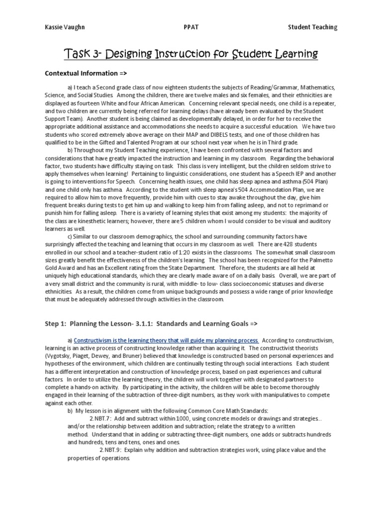 a) Constructivism is the learning theory that will guide my planning process. According to constructivism, learning is an active process of constructing knowledge rather than acquiring it. The constructivist theorists (Vygotsky, Piaget, Dewey, and Bruner) believed that knowledge is constructed based on personal experiences and hypotheses of the environment, which children are continually testing through social interactions. Each student has a different interpretation and construction of knowledge process, based on past experiences and cultural factors. In order to utilize the learning theory, the children will work together with designated partners to complete a hands-on activity. By participating in the activity, the children will be able to become thoroughly engaged in their learning of the subtraction of three-digit numbers, as they work with manipulatives to compete against each other. b) My lesson is in alignment with the following Common Core Math Standards: 2.NBT.7: Add and subtract within 1000, using concrete models or drawings and strategies... and/or the relationship between addition and subtraction; relate the strategy to a written method. Understand that in adding or subtracting three-digit numbers, one adds or subtracts hundreds and hundreds, tens and tens, ones and ones. 2.NBT.9: Explain why addition and subtraction strategies work, using place value and the properties of operations.