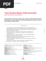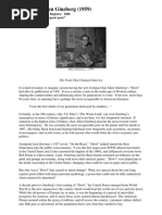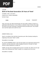 In 1957, at the age of fteen, I bought for seventy-ve cents a copy of the City Lights paperback edition of Howl and Other Poems with the trademark black-and-white cover. It was the rst book of poetry I ever bought, and it made me feel as cool as anyone in my high school. Howl was underground poetry, outlawed poetry. Ginsberg made it seem as though it was cool to be a teen and that teens, not adults, knew what was cool. To those of us I wasnt the only teenage beatnik in suburbiawho owned a copy, Howl conferred a strange power. Reading it brought initiation into a secret society. It bound us together and gave us a sense of identity as members of a new generation that had come of age in the wake of World War II and the atomic bomb, a generation that lived in the shadow of nuclear apocalypse. There was something wonderfully subversive about Howl, something the poet had hidden in the body of the poem because it was too dangerous to say openly, something we had to uncover and decode.