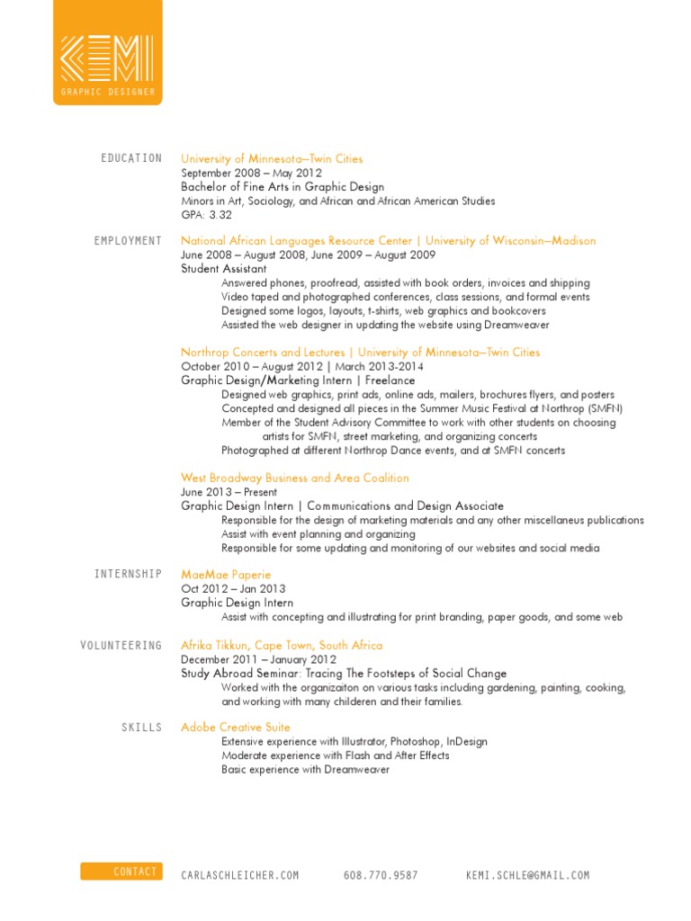 University of MinnesotaTwin Cities September 2008 May 2012 Bachelor of Fine Arts in Graphic Design Minors in Art, Sociology, and African and African American Studies GPA: 3.32 National African Languages Resource Center | University of WisconsinMadison June 2008 August 2008, June 2009 August 2009 Student Assistant Answered phones, proofread, assisted with book orders, invoices and shipping Video taped and photographed conferences, class sessions, and formal events Designed some logos, layouts, t-shirts, web graphics and bookcovers Assisted the web designer in updating the website using Dreamweaver Northrop Concerts and Lectures | University of MinnesotaTwin Cities October 2010 August 2012 | March 2013-2014 Graphic Design/Marketing Intern | Freelance Designed web graphics, print ads, online ads, mailers, brochures flyers, and posters Concepted and designed all pieces in the Summer Music Festival at Northrop (SMFN) Member of the Student Advisory Committee to work with other students on choosing artists for SMFN, street marketing, and organizing concerts Photographed at different Northrop Dance events, and at SMFN concerts West Broadway Business and Area Coalition June 2013 Present Graphic Design Intern | Communications and Design Associate Responsible for the design of marketing materials and any other miscellaneus publications Assist with event planning and organizing Responsible for some updating and monitoring of our websites and social media